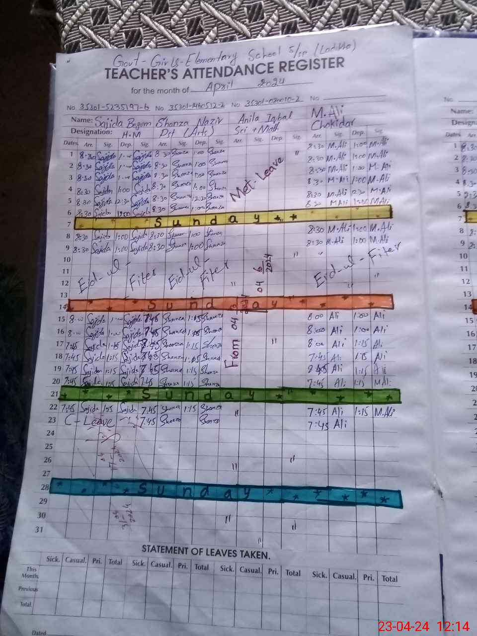 | CNIC | Full Name | Designation | R/C | Absence During Last Calender Month |