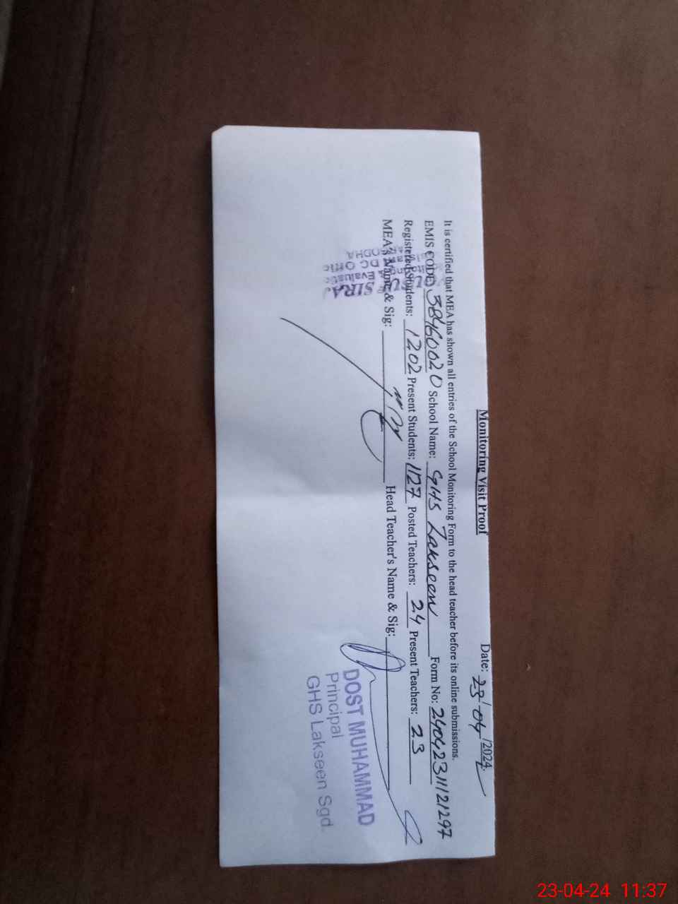 | Attendance Register | Head Teacher | MEA with School | Visit Proof |