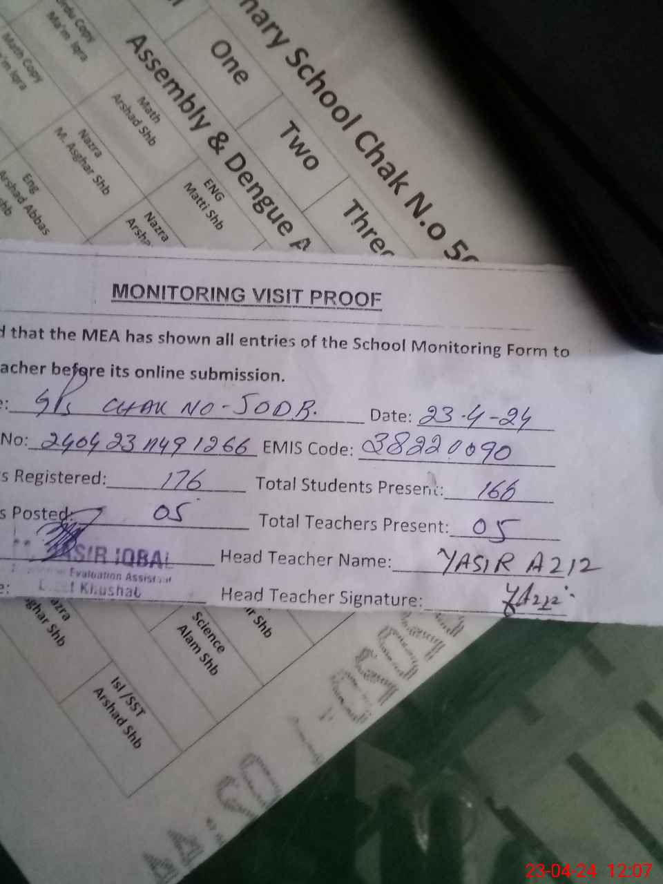 | EMIS Code: 38220090 | Name of School: GES CHAK NO. 50/DB | |||
