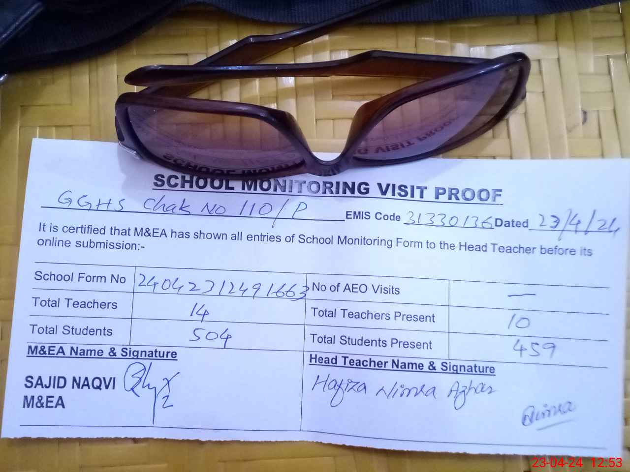 | Attendance Register | Head Teacher | MEA with School | Visit Proof |