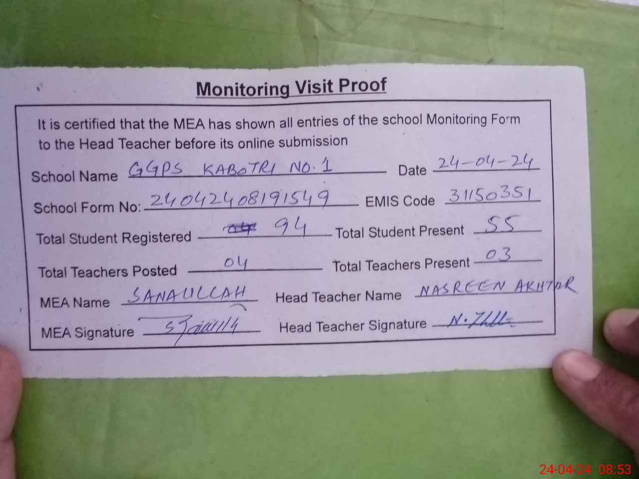 | Attendance Register | Head Teacher | MEA with School | Visit Proof |