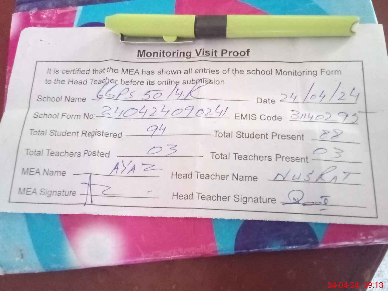 | Attendance Register | Head Teacher | MEA with School | Visit Proof |
