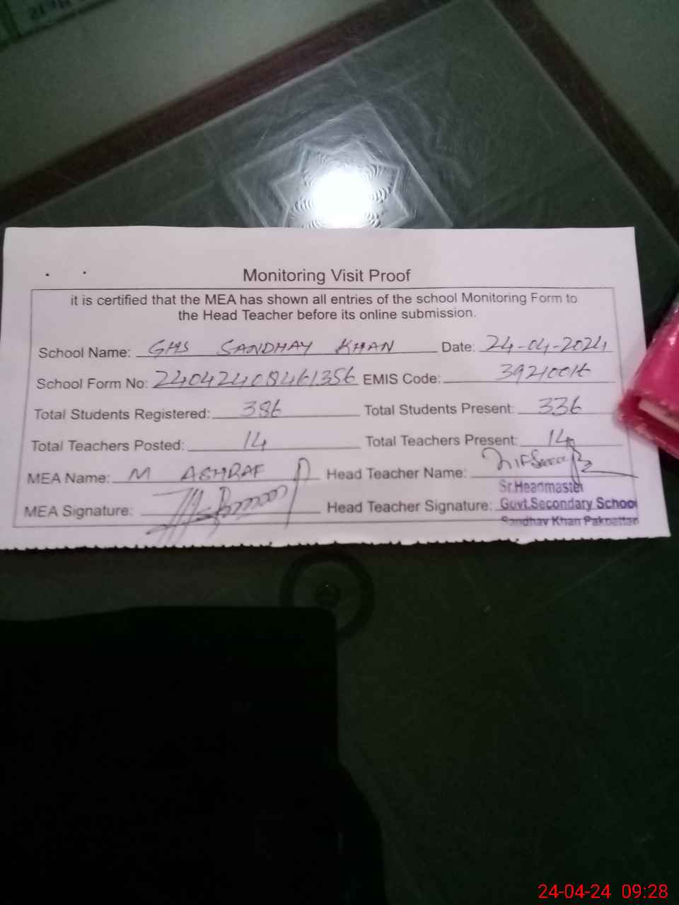 | EMIS Code: 39210016 | Name of School: GHS CHAK SANDHAY KHAN | |||