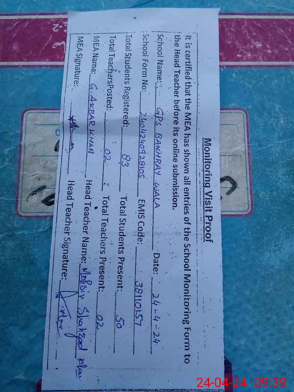 | EMIS Code: 38110157 | Name of School: GPS BAKHRRAY WALA | |||