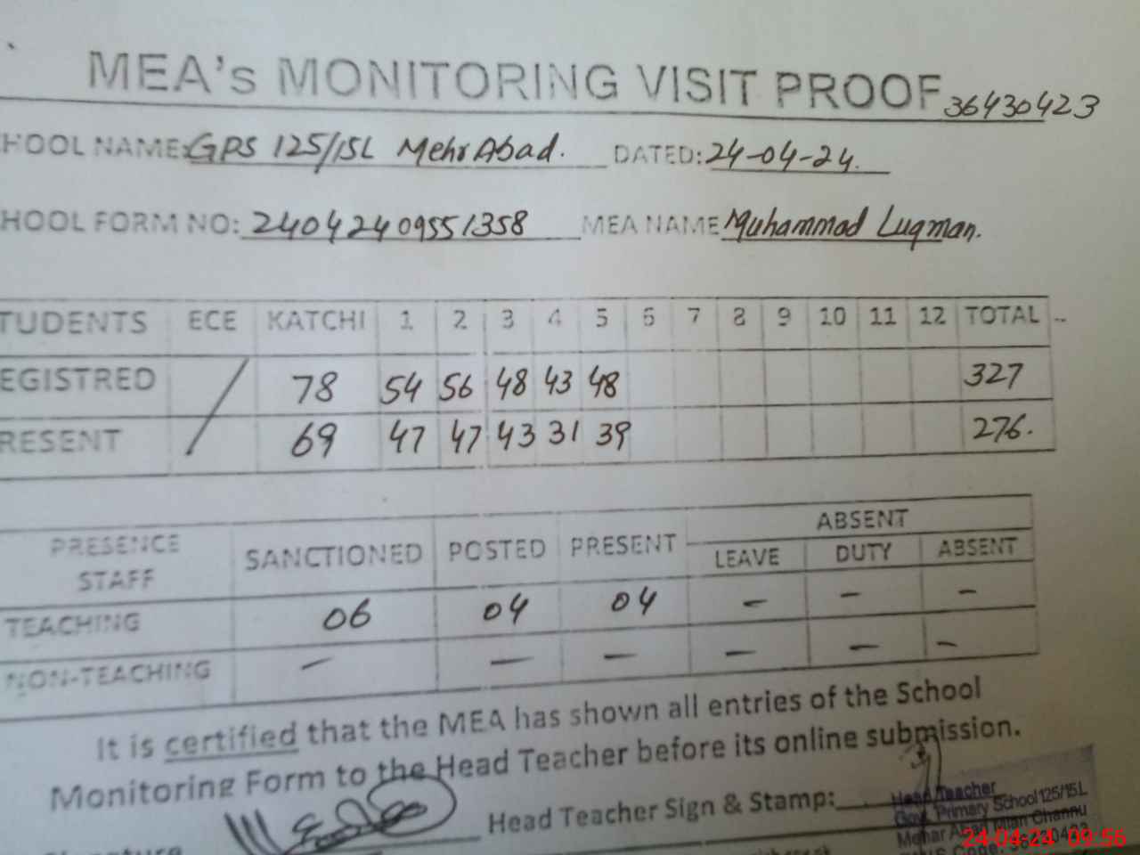 | Attendance Register | Head Teacher | MEA with School | Visit Proof |