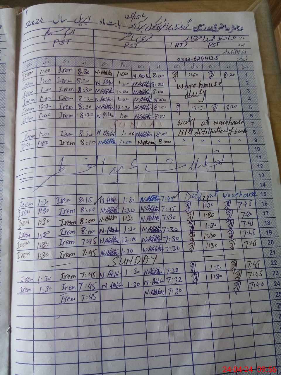 | Name: MU**** Sh**** Designation: (School Headmaster's/Headmistress's) PST Phone/Cell Number: 03**** |
