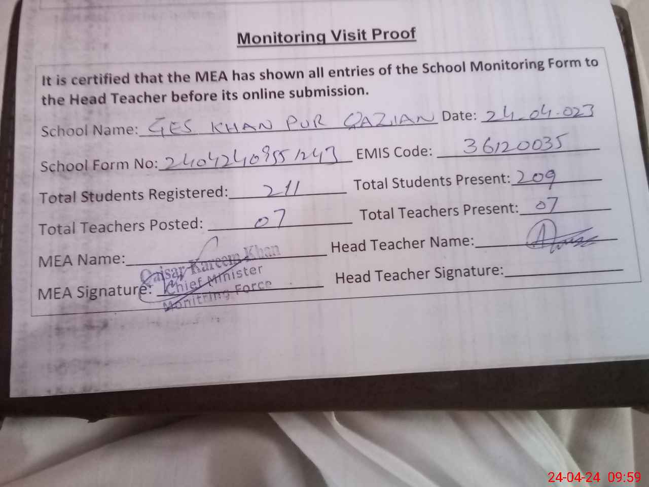 | EMIS Code: 36120035 | Name of School: GES KHANPUR QAZIAN SHUJABAD | |||