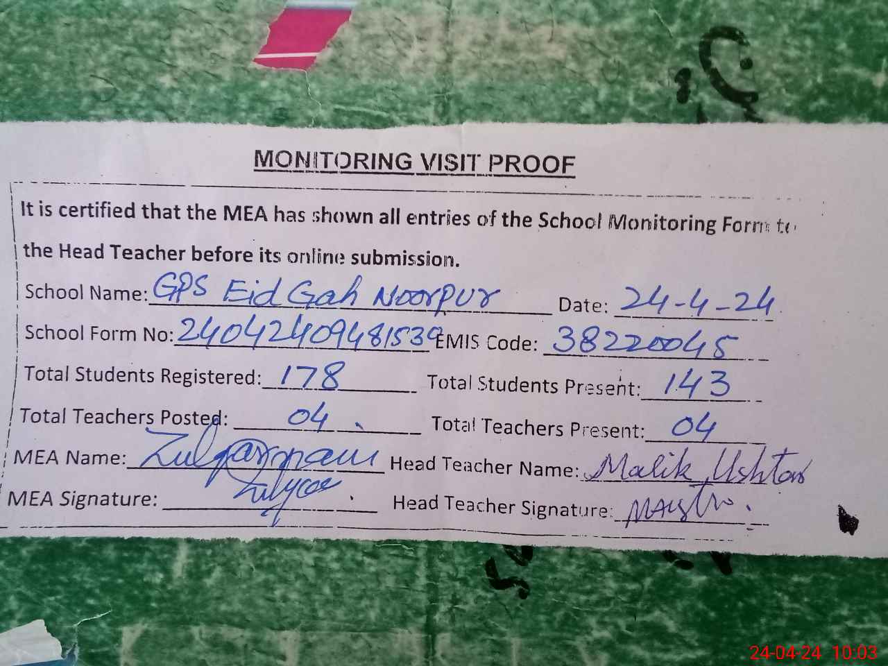 | Attendance Register | Head Teacher | MEA with School | Visit Proof |