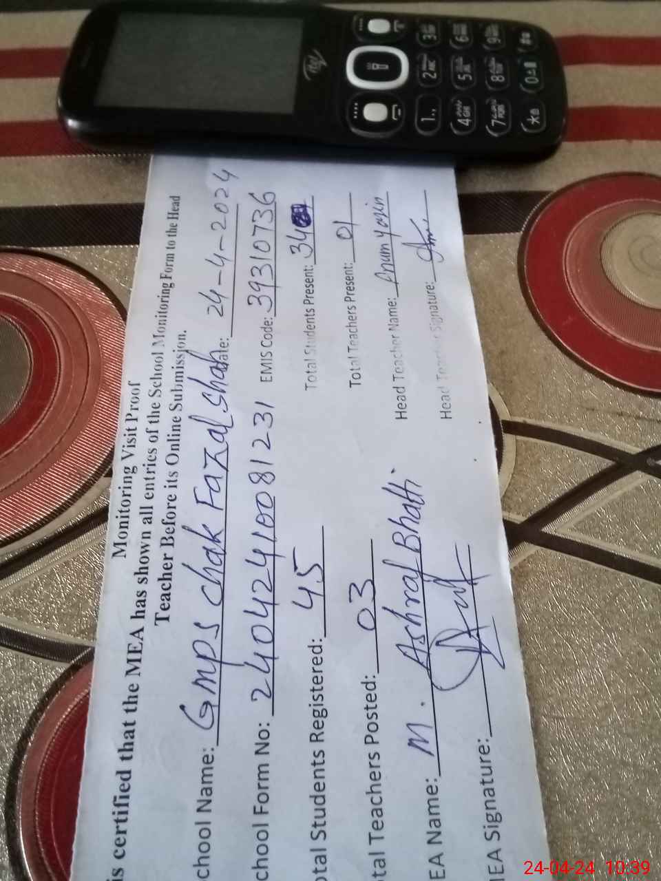 | Name: An**** Ya**** Designation: (School Headmaster's/Headmistress's) PST Phone/Cell Number: 03**** |