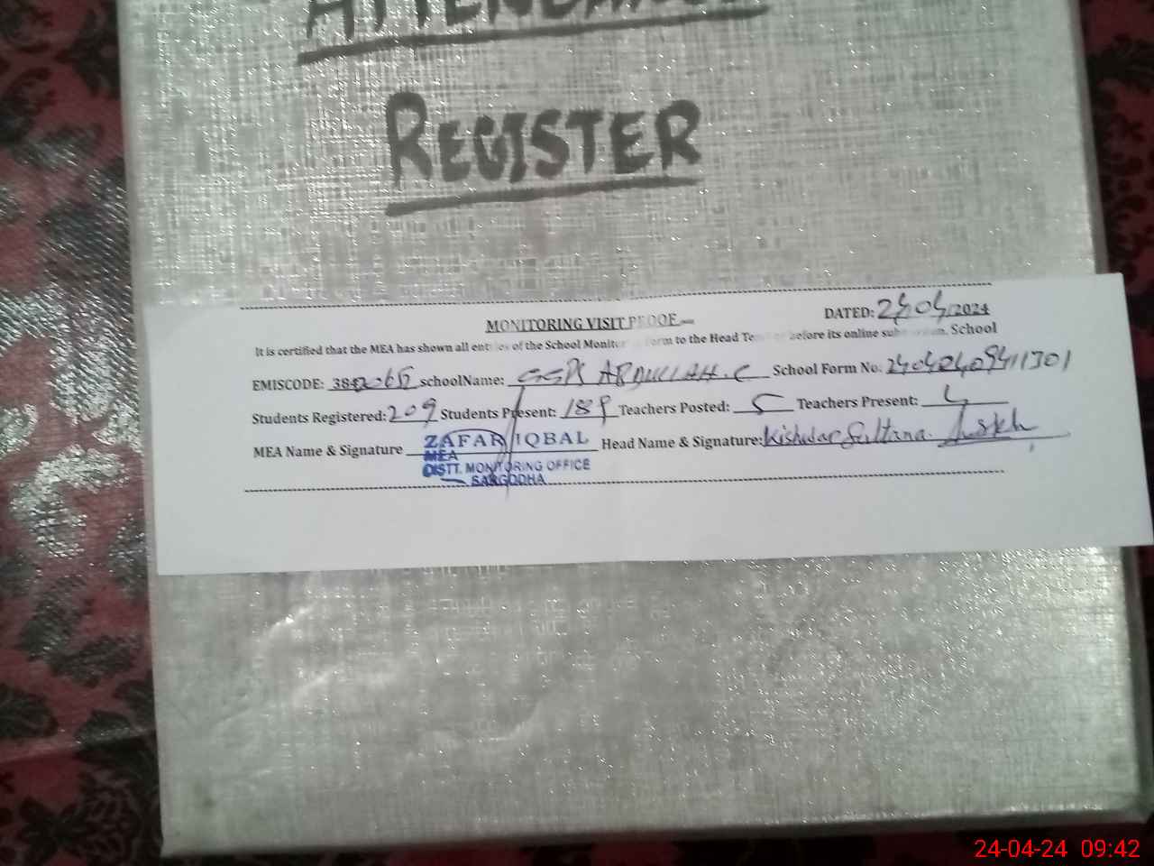 | Attendance Register | Head Teacher | MEA with School | Visit Proof |