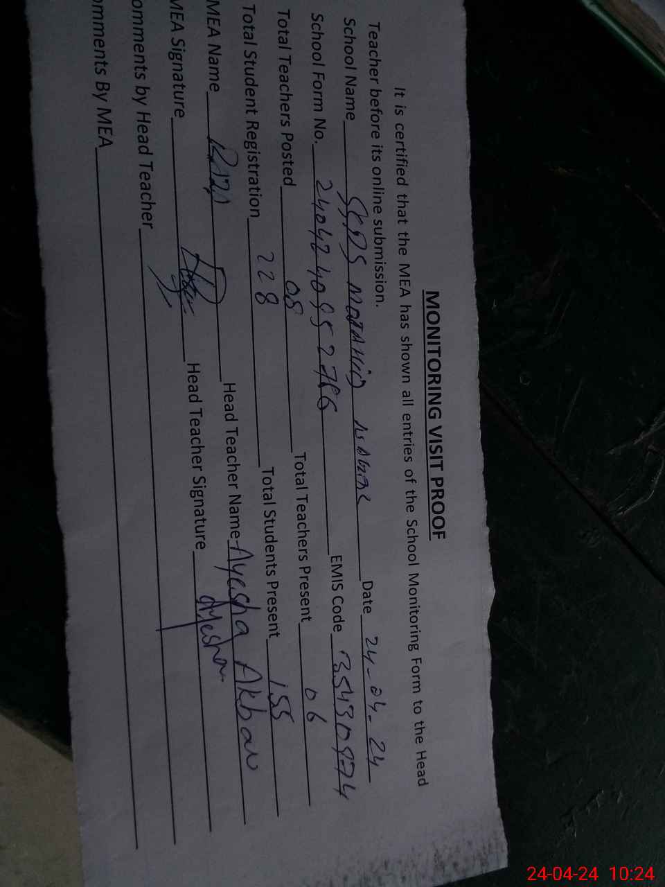 | Attendance Register | Head Teacher | MEA with School | Visit Proof |