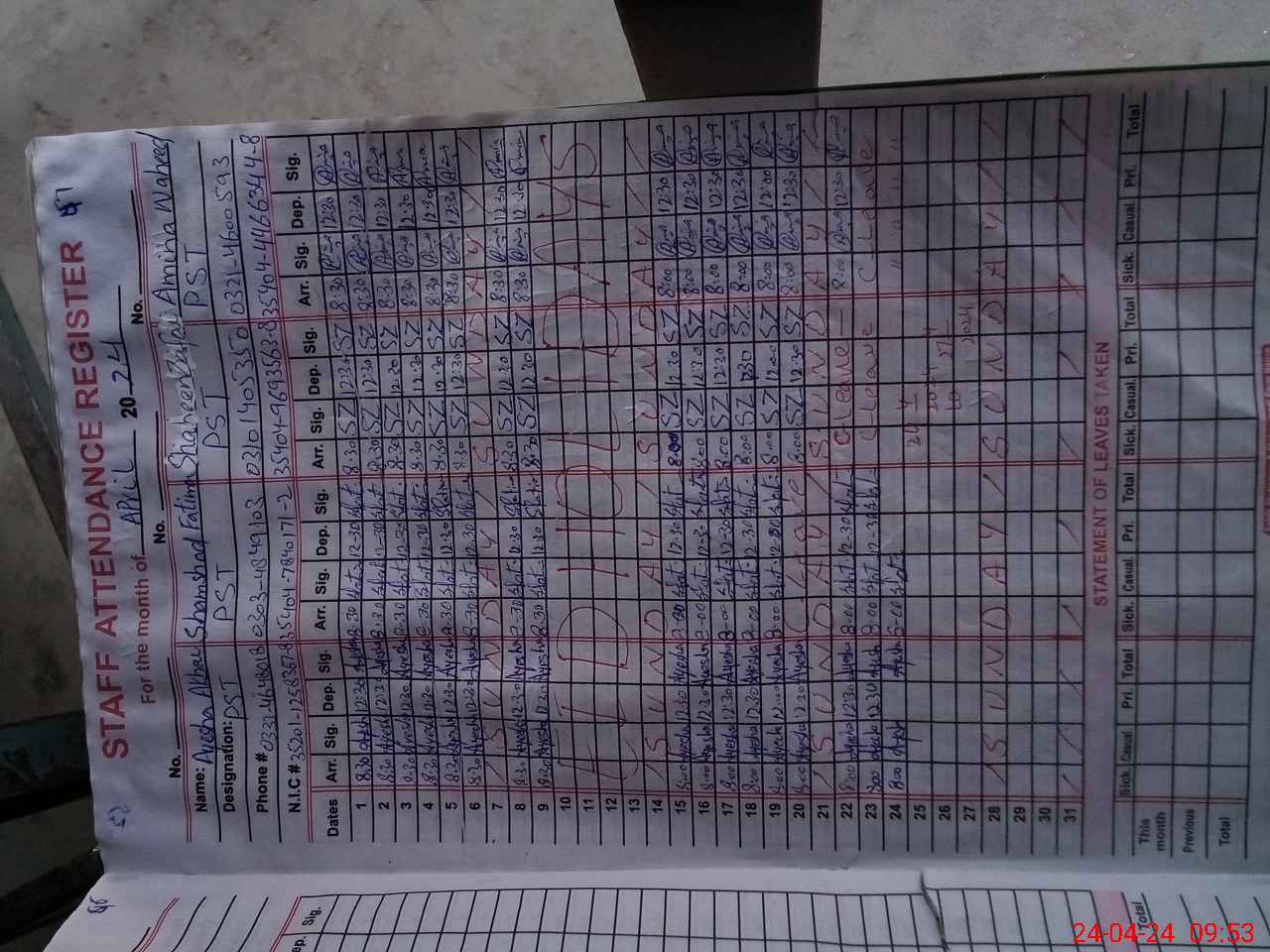 | CNIC | Full Name | Designation | R/C | Absence During Last Calender Month |