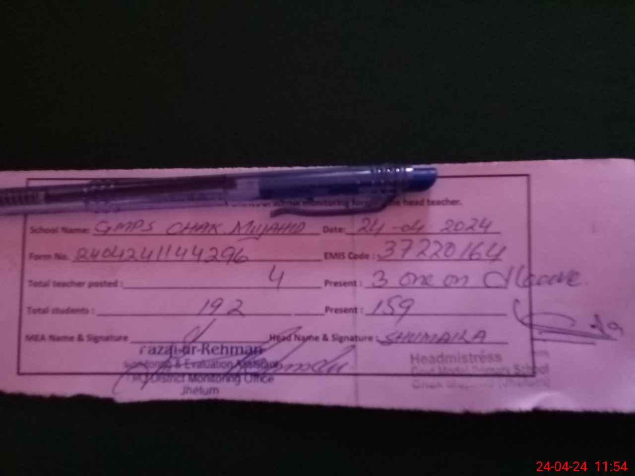| Name: MA**** NA**** Designation: (School Headmaster's/Headmistress's) H M Phone/Cell Number: 03**** |