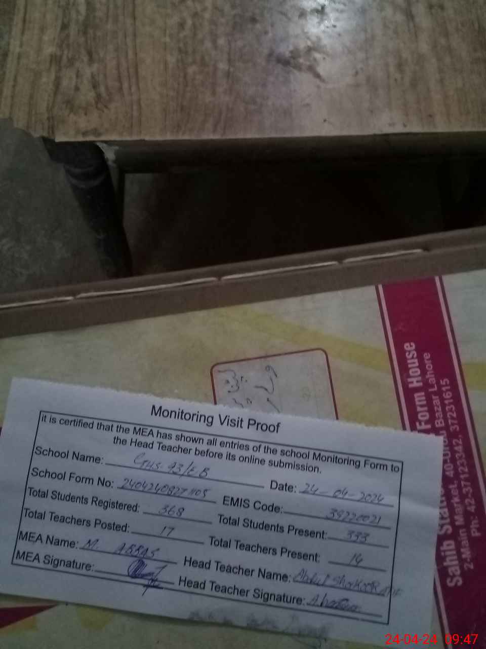 | Attendance Register | Head Teacher | MEA with School | Visit Proof |