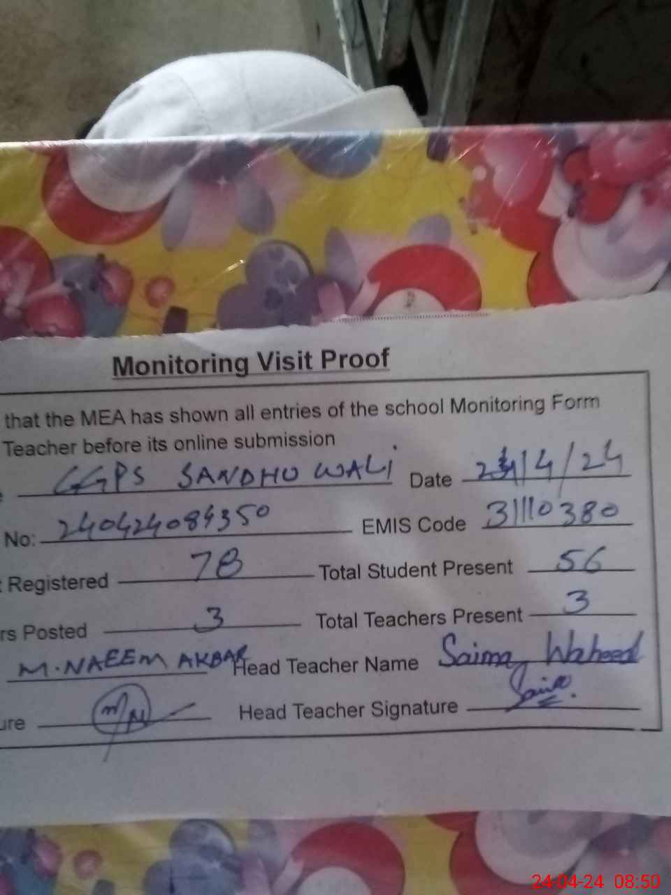 | EMIS Code: 31110380 | Name of School: GGPS SANDHU WALI | |||