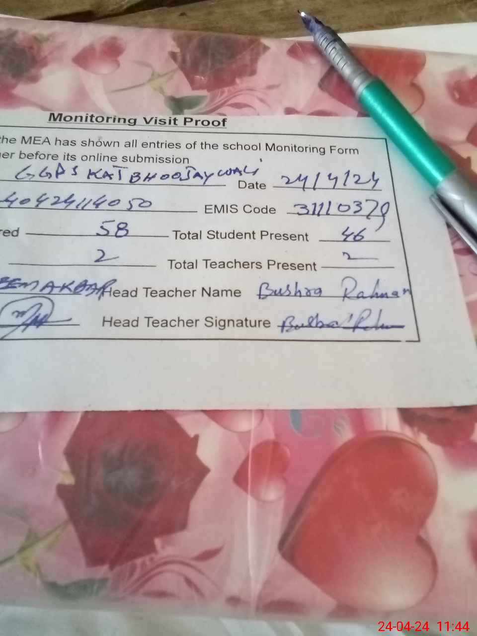 | Attendance Register | Head Teacher | MEA with School | Visit Proof |