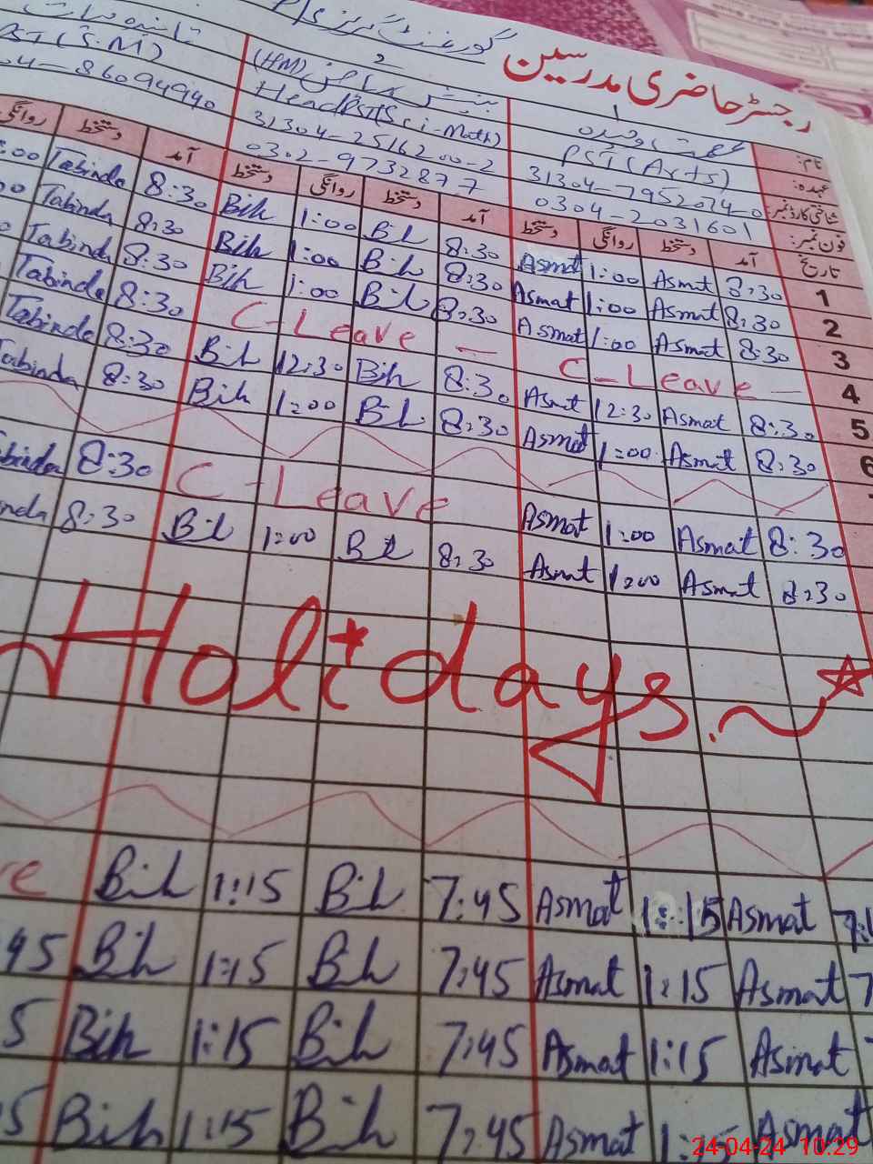 | CNIC | Full Name | Designation | R/C | Absence During Last Calender Month |