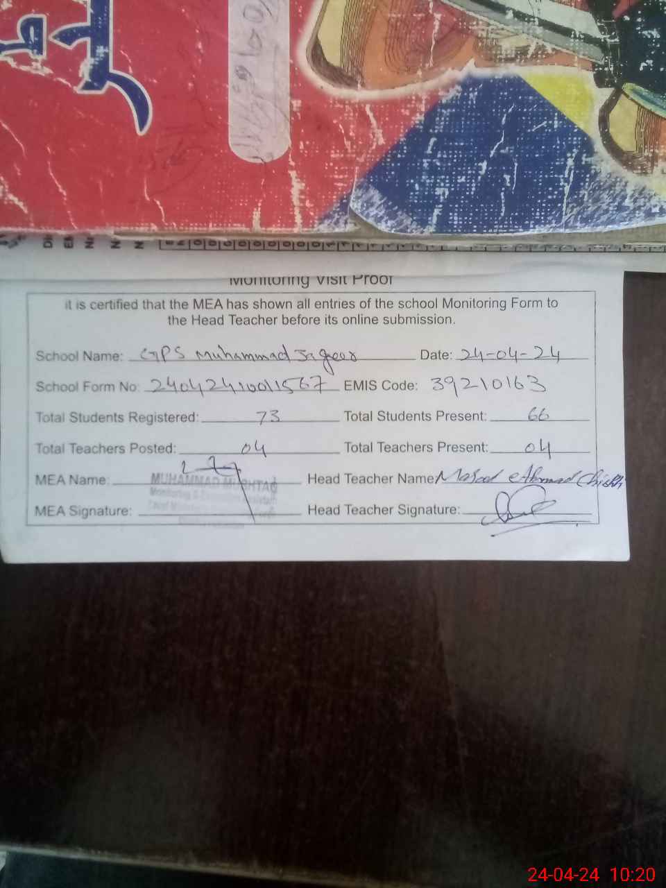 | Attendance Register | Head Teacher | MEA with School | Visit Proof |