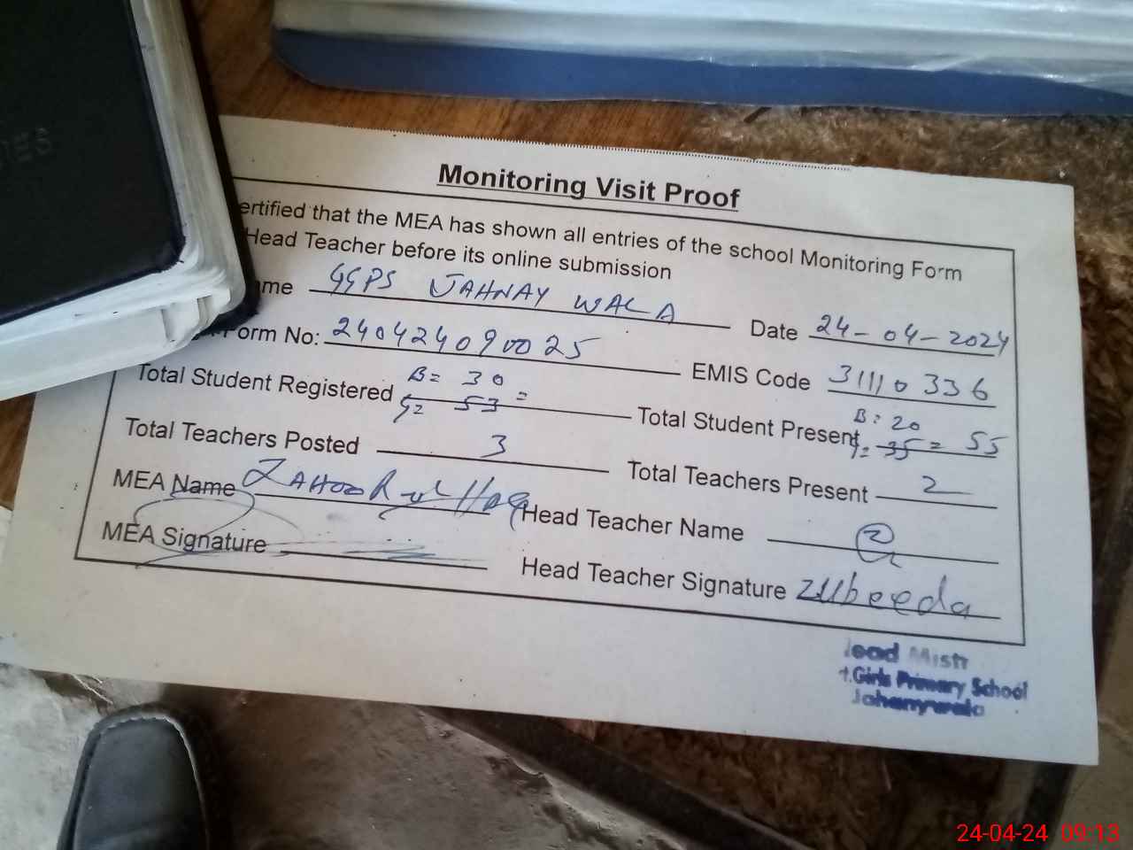 | EMIS Code: 31110336 | Name of School: GGPS JAHANAY WALA | |||