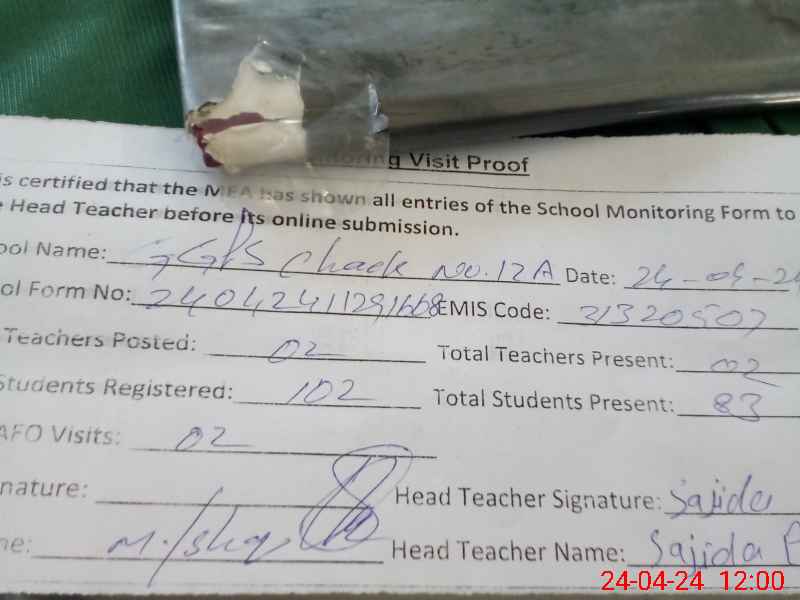 | EMIS Code: 31320507 | Name of School: GGPS CHAK NO.12/A | |||