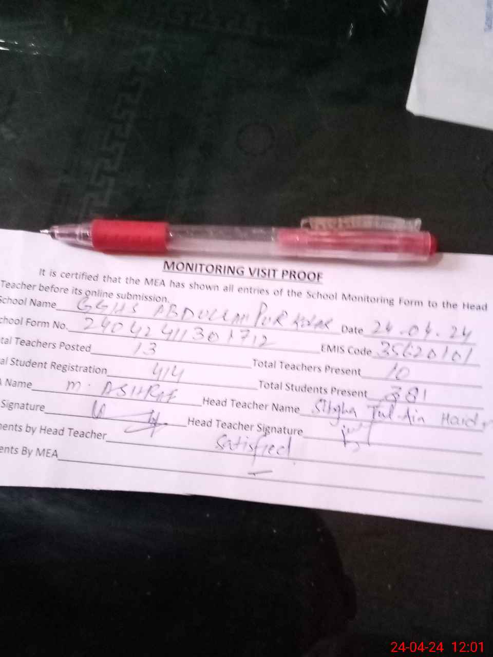| Attendance Register | Head Teacher | MEA with School | Visit Proof |