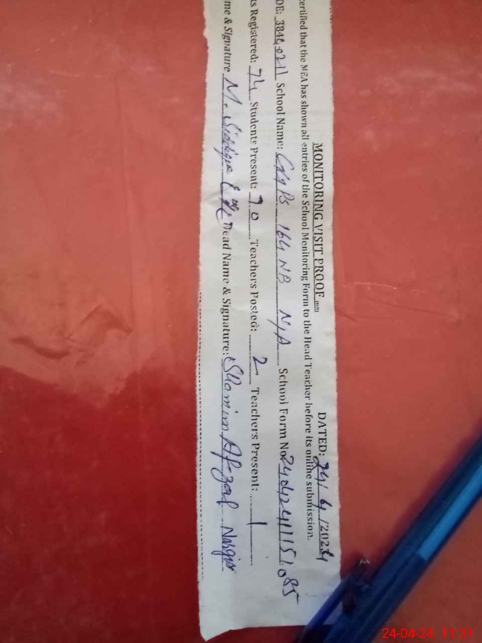 | Attendance Register | Head Teacher | MEA with School | Visit Proof |