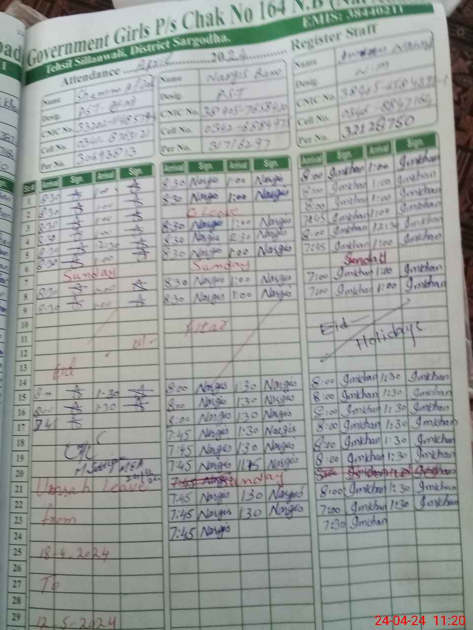 | CNIC | Full Name | Designation | R/C | Absence During Last Calender Month |