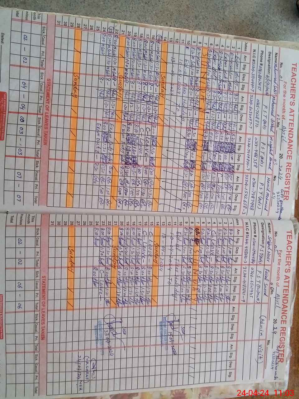 | CNIC | Full Name | Designation | R/C | Absence During Last Calender Month |