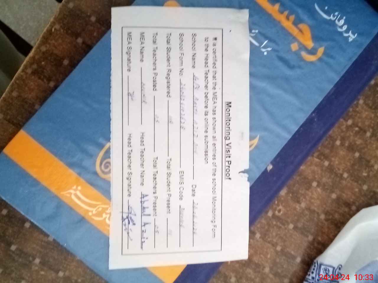 | Attendance Register | Head Teacher | MEA with School | Visit Proof |