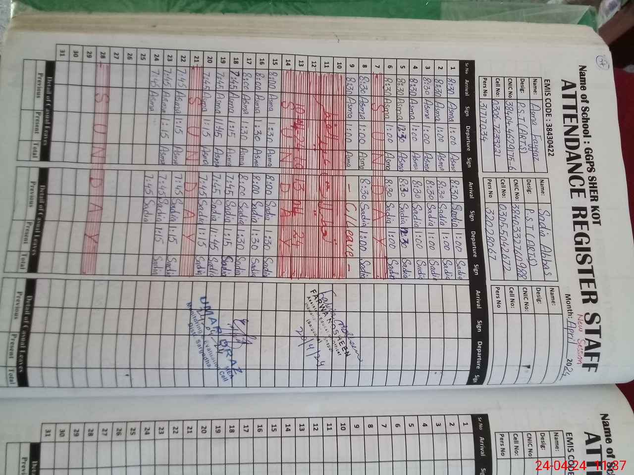| Name: AS**** FA**** Designation: (School Headmaster's/Headmistress's) PST Phone/Cell Number: 03**** |