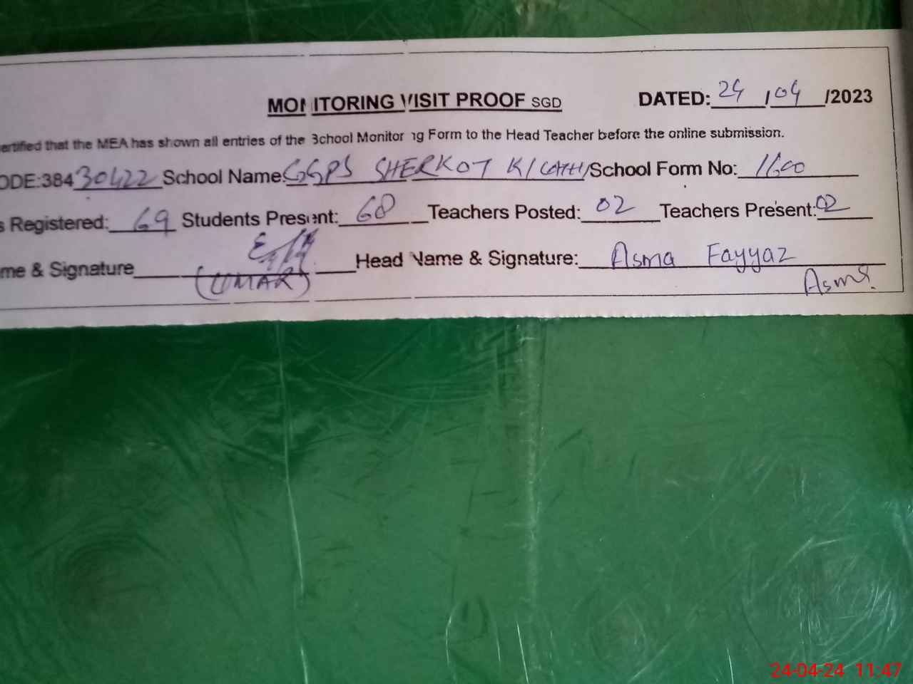 | Attendance Register | Head Teacher | MEA with School | Visit Proof |