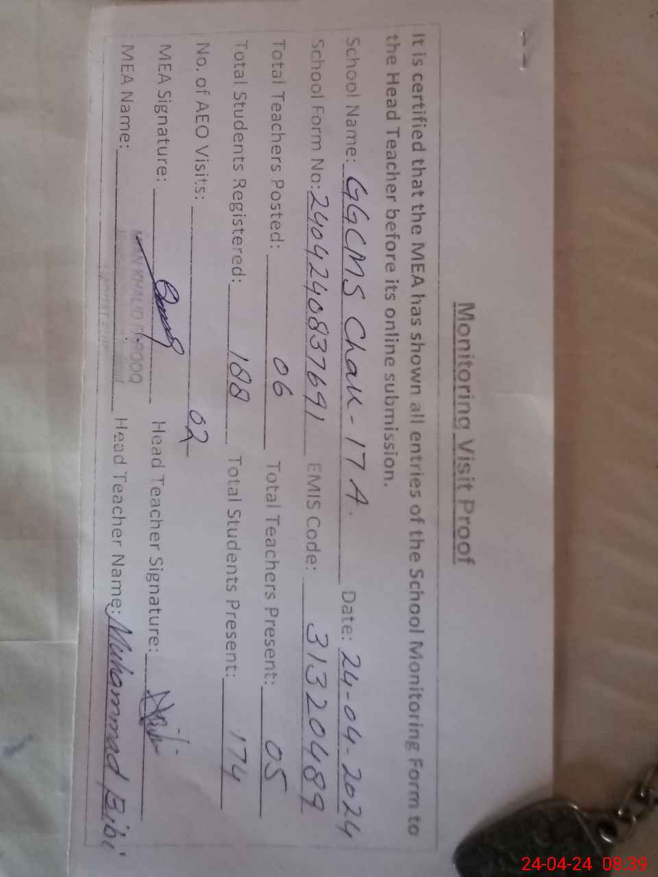 | Attendance Register | Head Teacher | MEA with School | Visit Proof |