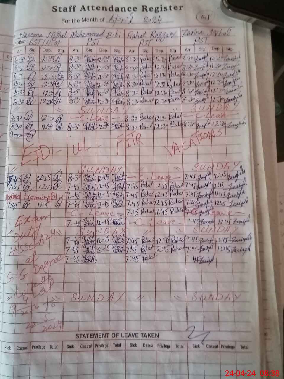 | Leave | Duty | Absent | Maternity | Medical | Ex- Pak |