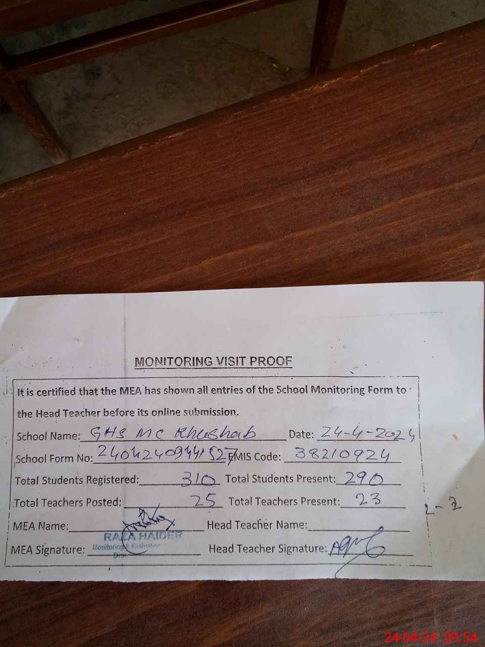 | EMIS Code: 38210924 | Name of School: GHS MC KHUSHAB | |||