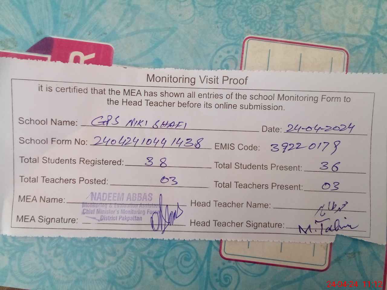 | EMIS Code: 39220179 | Name of School: GPS NIKKI SHAFI P/O SHAFI ARIFWALA | |||