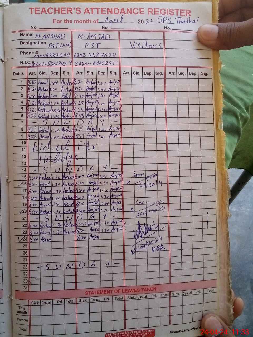| Name: MU**** AR**** Designation: (School Headmaster's/Headmistress's) PST Phone/Cell Number: 03**** |
