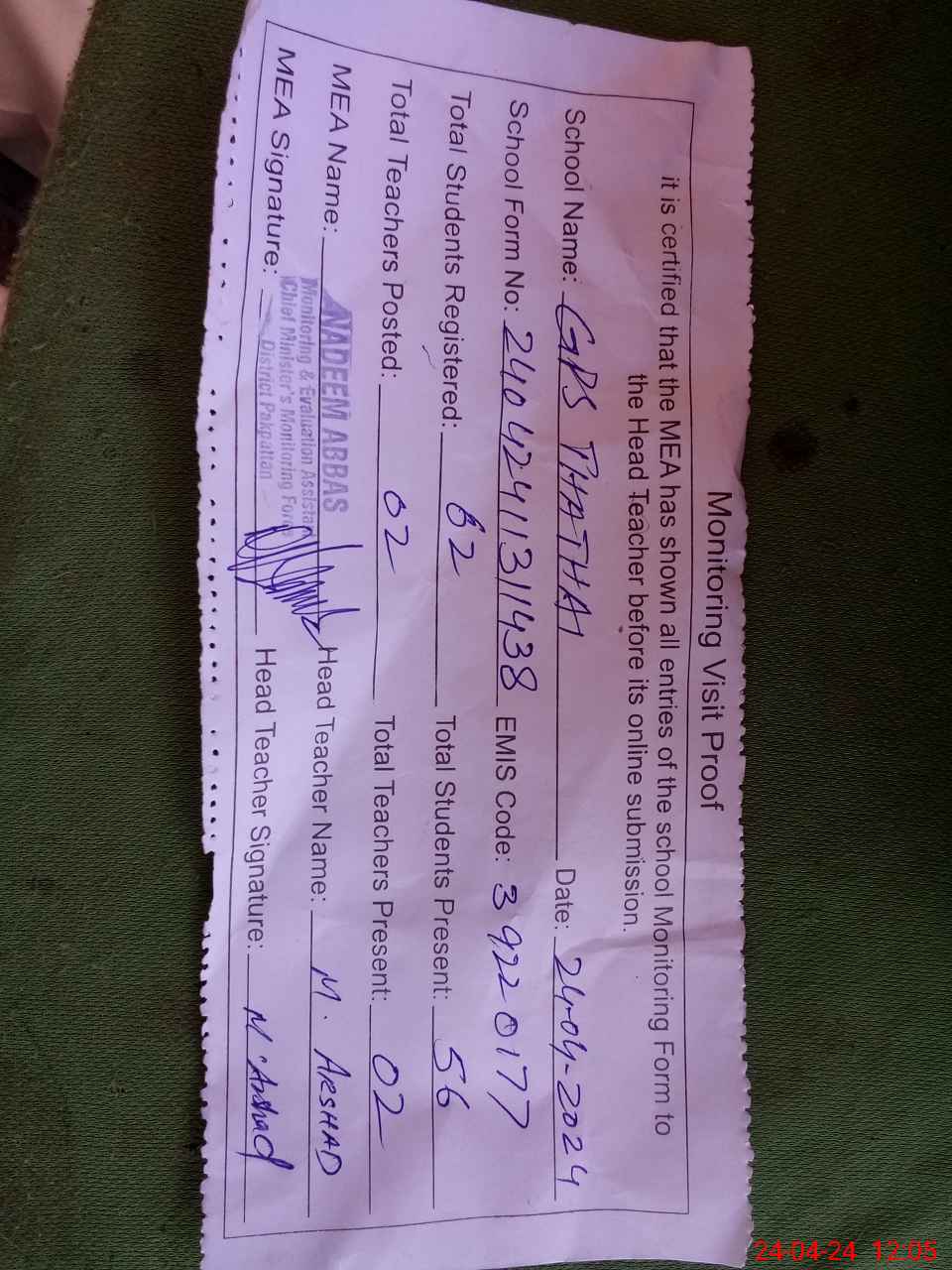 | EMIS Code: 39220177 | Name of School: GPS THATHAI P/O SAME TEH ARIF WALA | |||