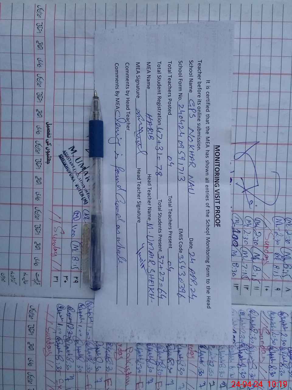 | Attendance Register | Head Teacher | MEA with School | Visit Proof |