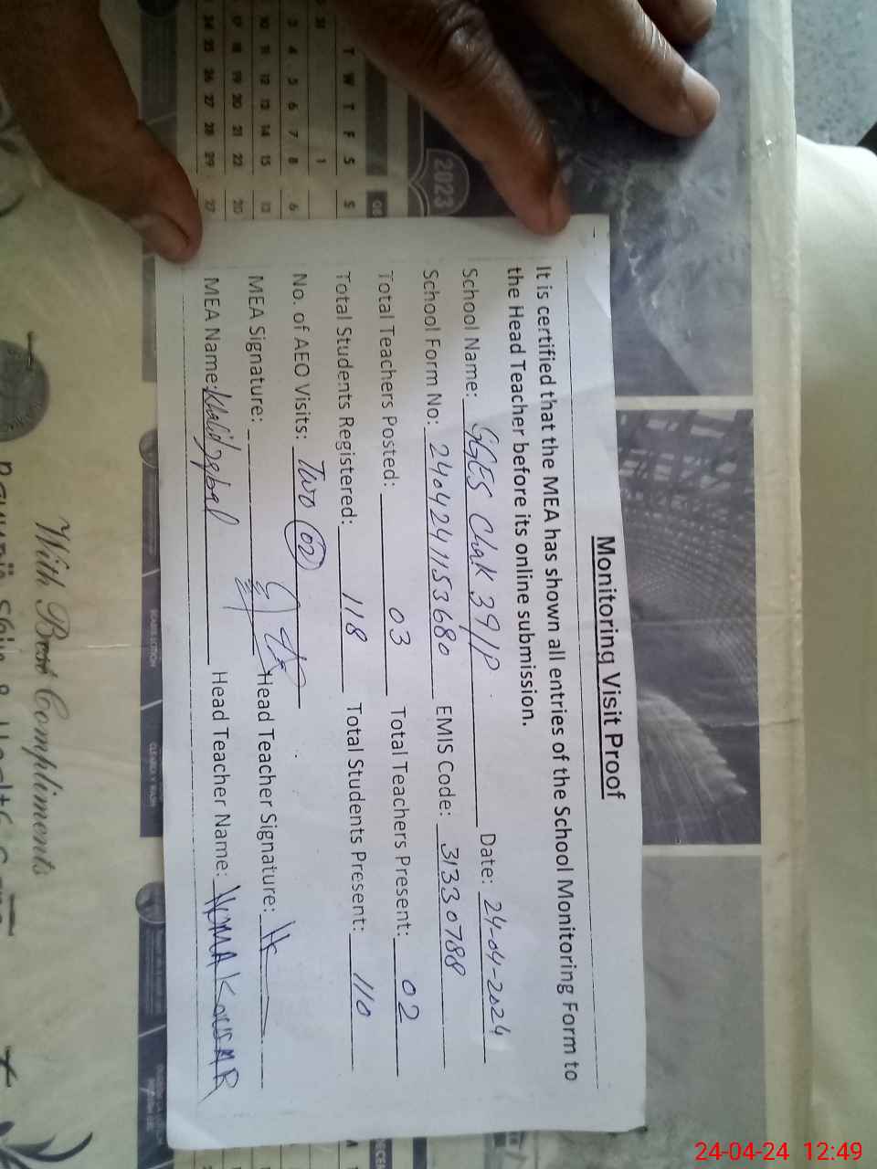 | Attendance Register | Head Teacher | MEA with School | Visit Proof |