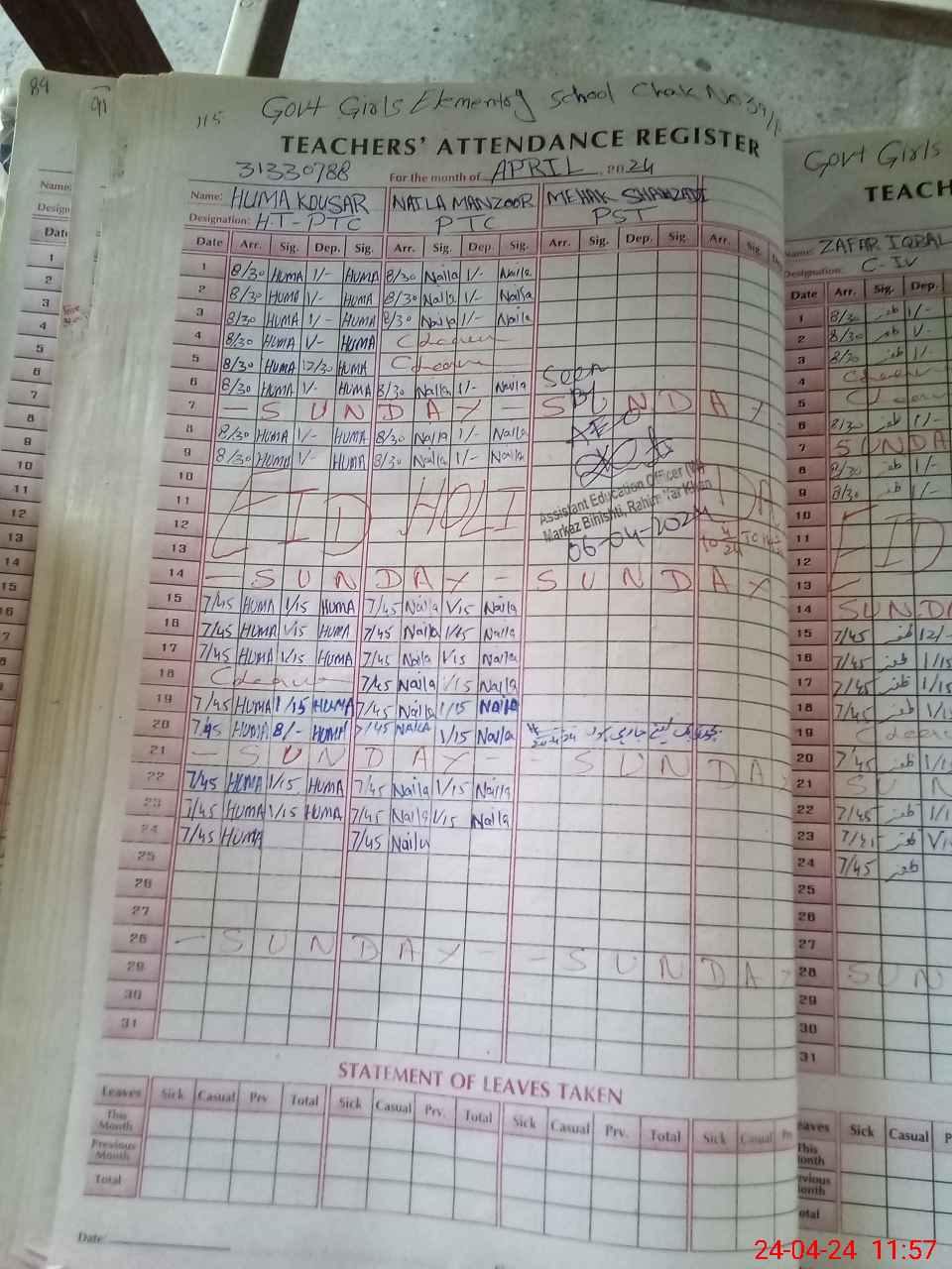 | Leave | Duty | Absent | Maternity | Medical | Ex- Pak |