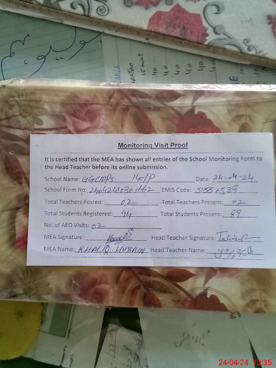 | Attendance Register | Head Teacher | MEA with School | Visit Proof |
