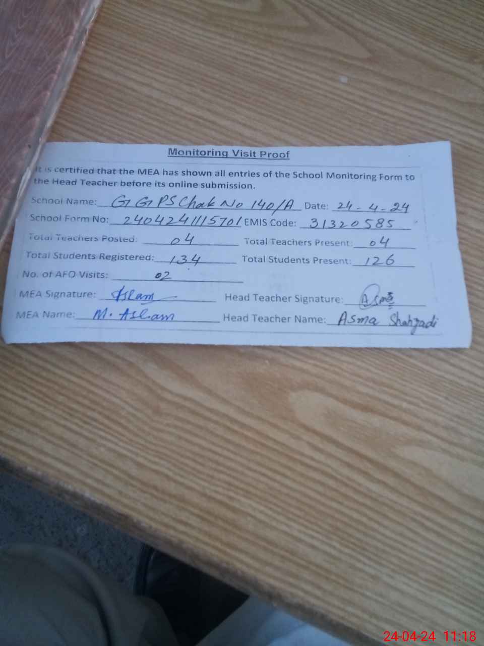 | EMIS Code: 31320585 | Name of School: GGPS CHAK NO.140/A | |||