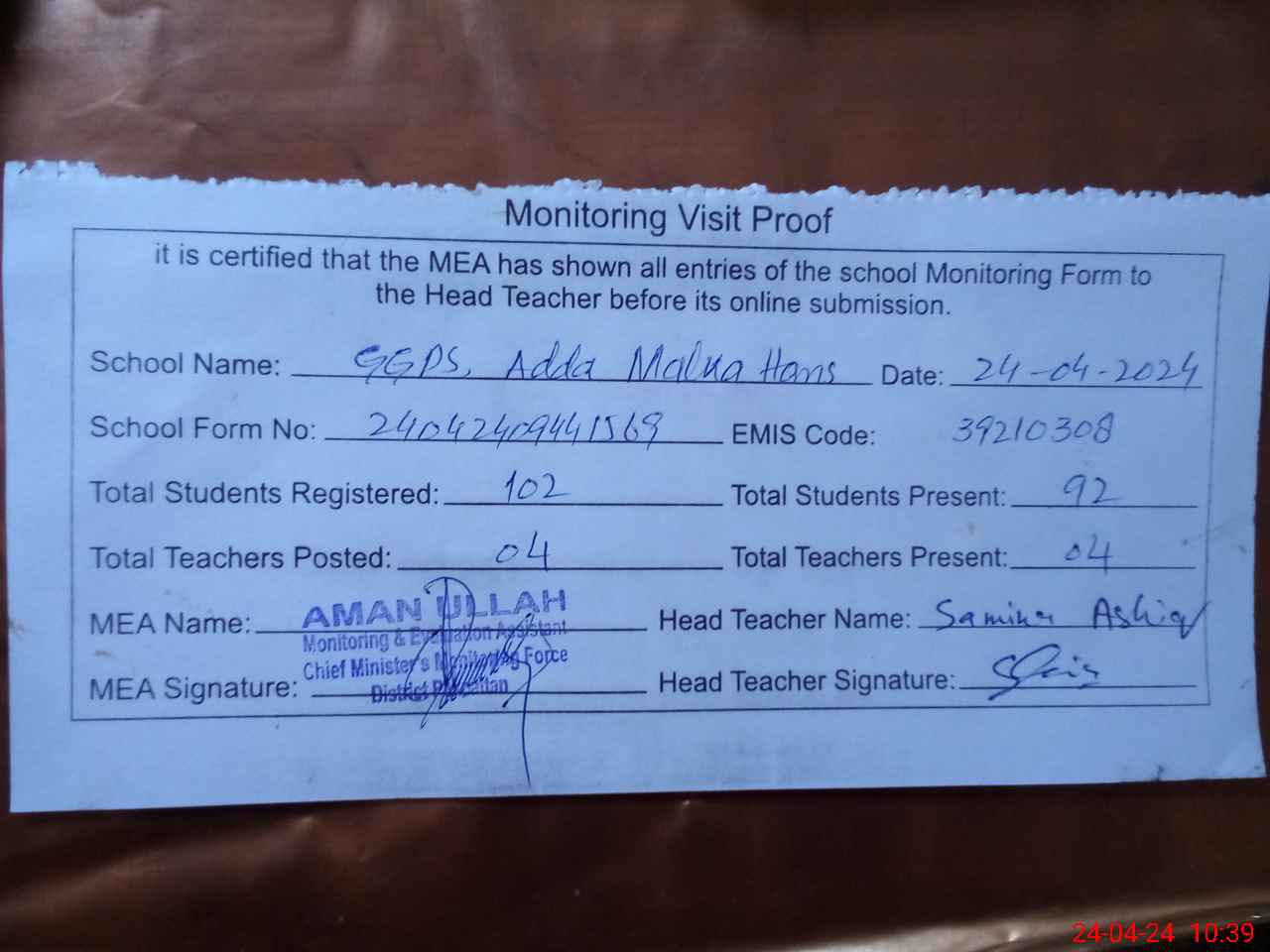 | Attendance Register | Head Teacher | MEA with School | Visit Proof |
