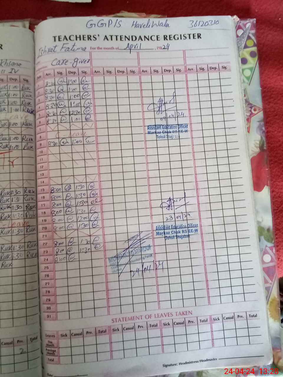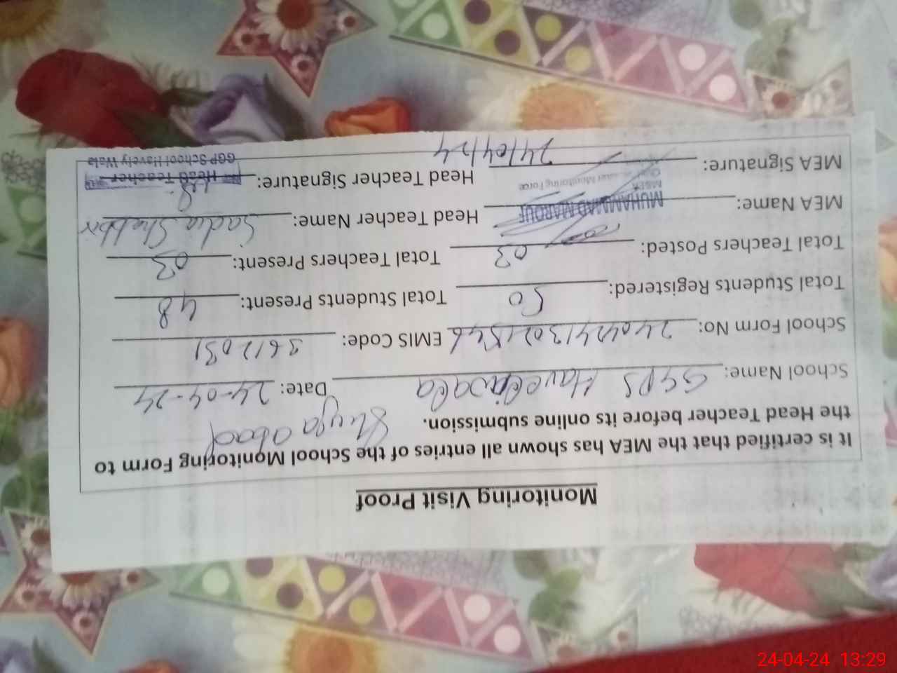 | Attendance Register | Head Teacher | MEA with School | Visit Proof |