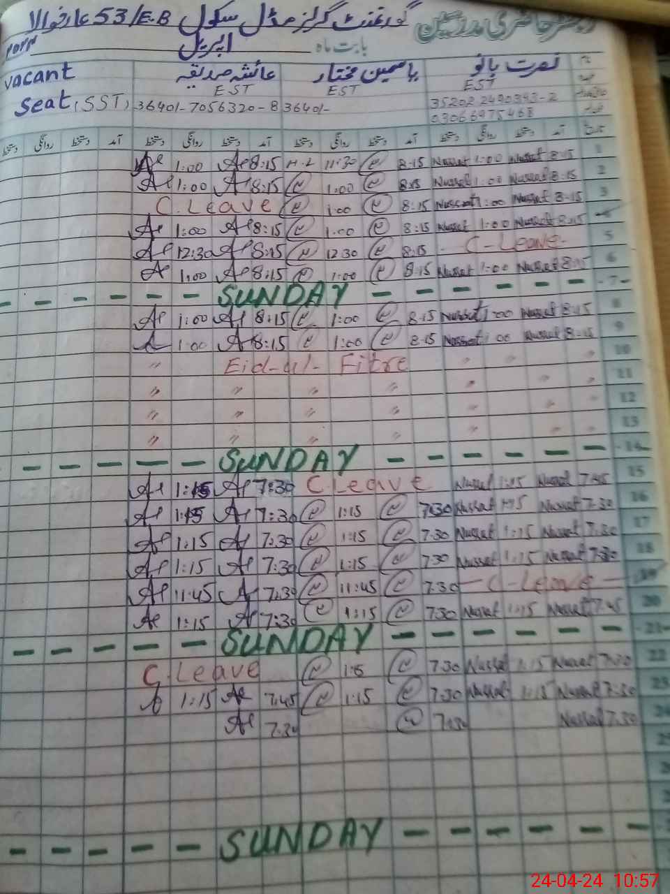 | Leave | Duty | Absent | Maternity | Medical | Ex- Pak |