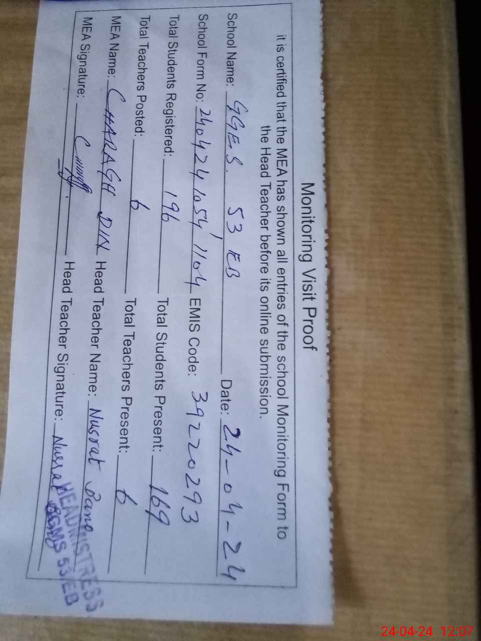 | Attendance Register | Head Teacher | MEA with School | Visit Proof |