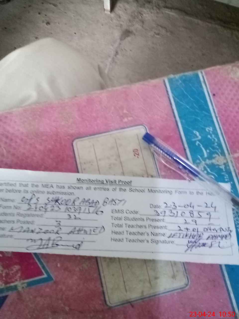 | Attendance Register | Head Teacher | MEA with School | Visit Proof |