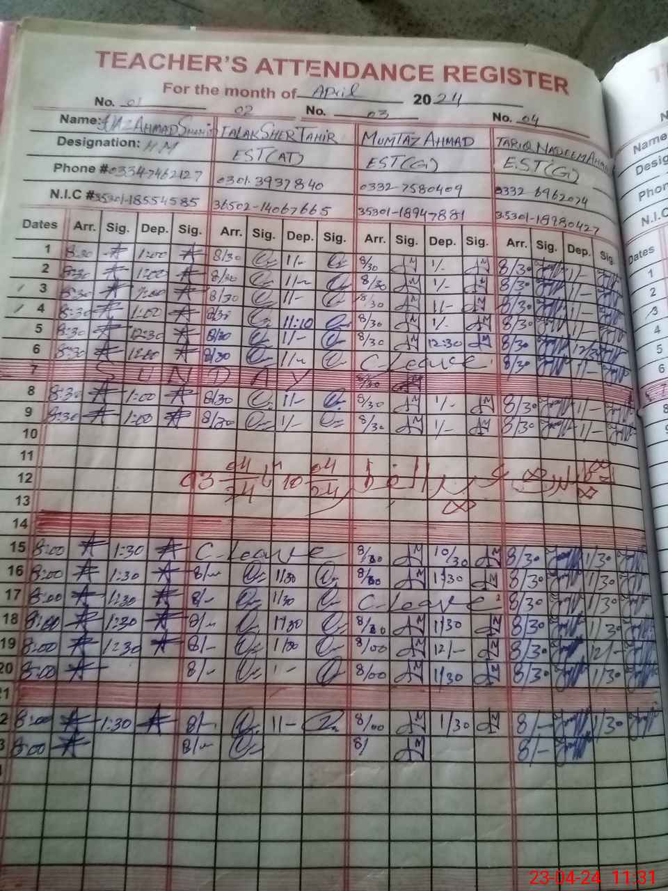 | CNIC | Full Name | Designation | R/C | Absence During Last Calender Month |