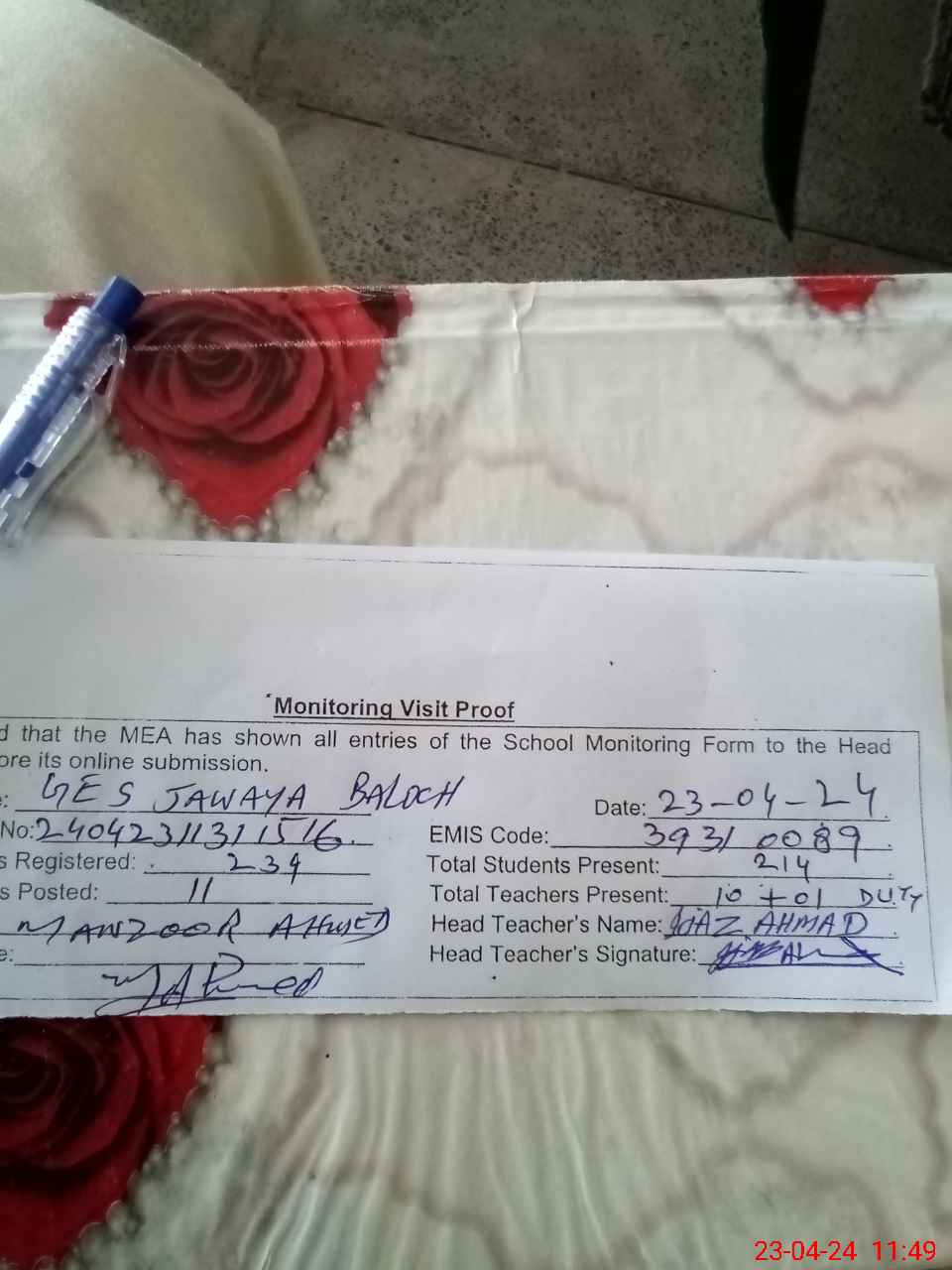 | Attendance Register | Head Teacher | MEA with School | Visit Proof |