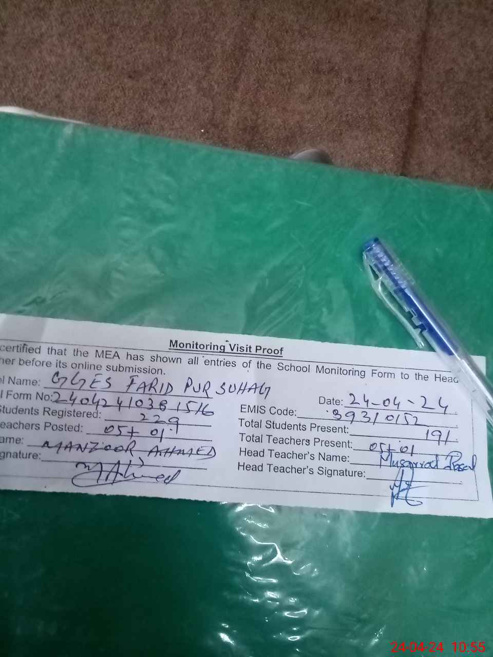 | Attendance Register | Head Teacher | MEA with School | Visit Proof |